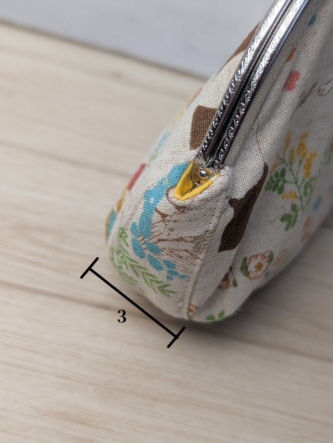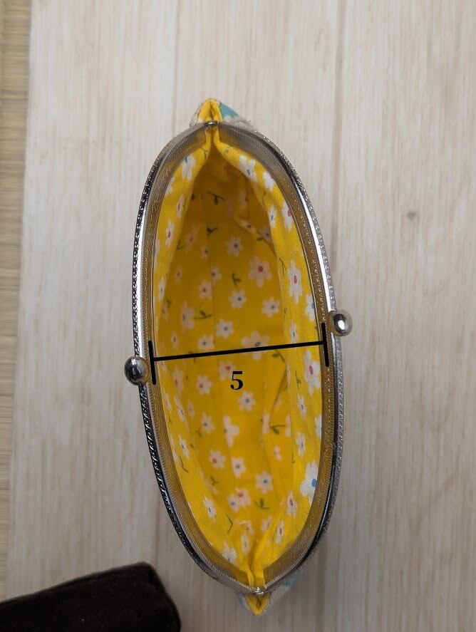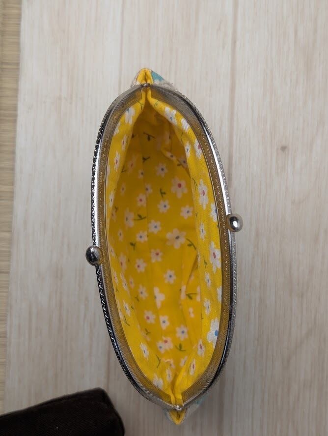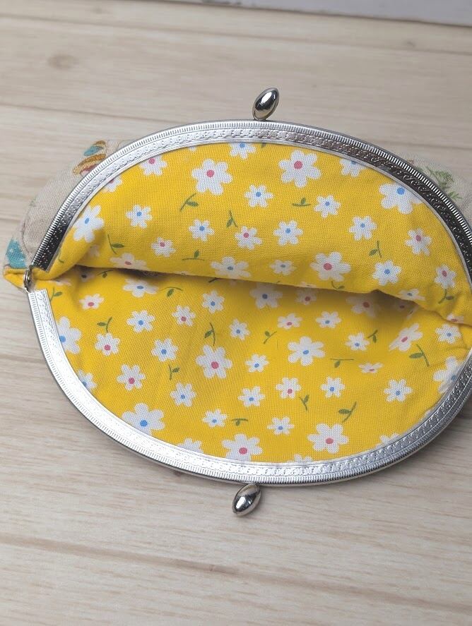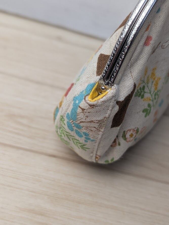 雨屋のがま口は通常ドミット芯をたっぷり使いふっくらさせているものが多いのですが、こちらは生地がしっかりしていることやがま口の口の部分の狭さから薄手のドミット芯を一枚入れているだけなので、ふんわり感はあまりありません。