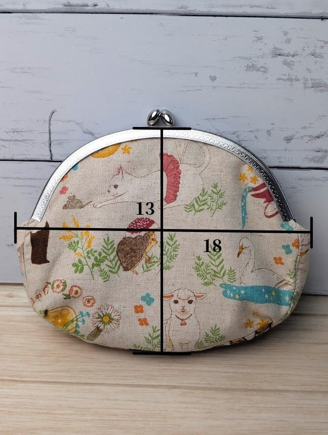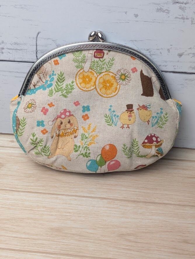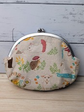 優しい生成りの色合いの中に猫さんやヒヨコさんやハリネズミさんなどがのびのびと描かれた可愛らしい生地のがま口です。