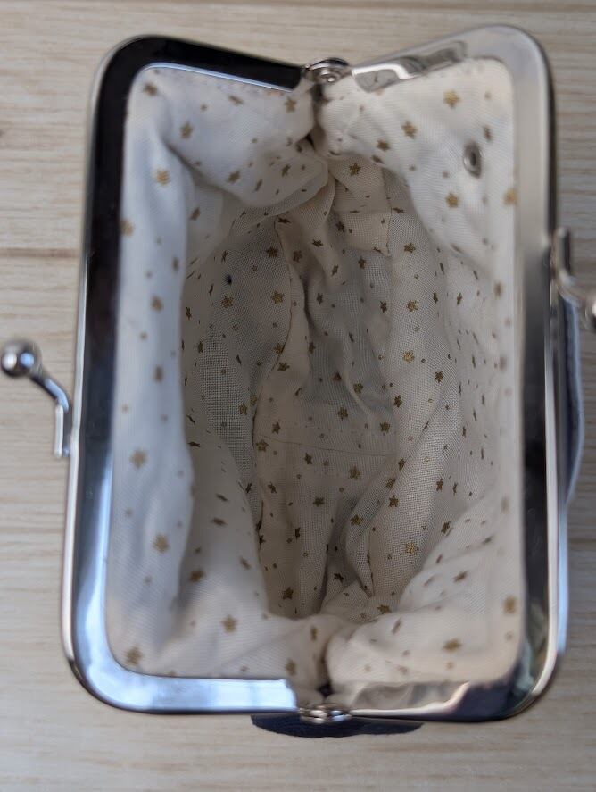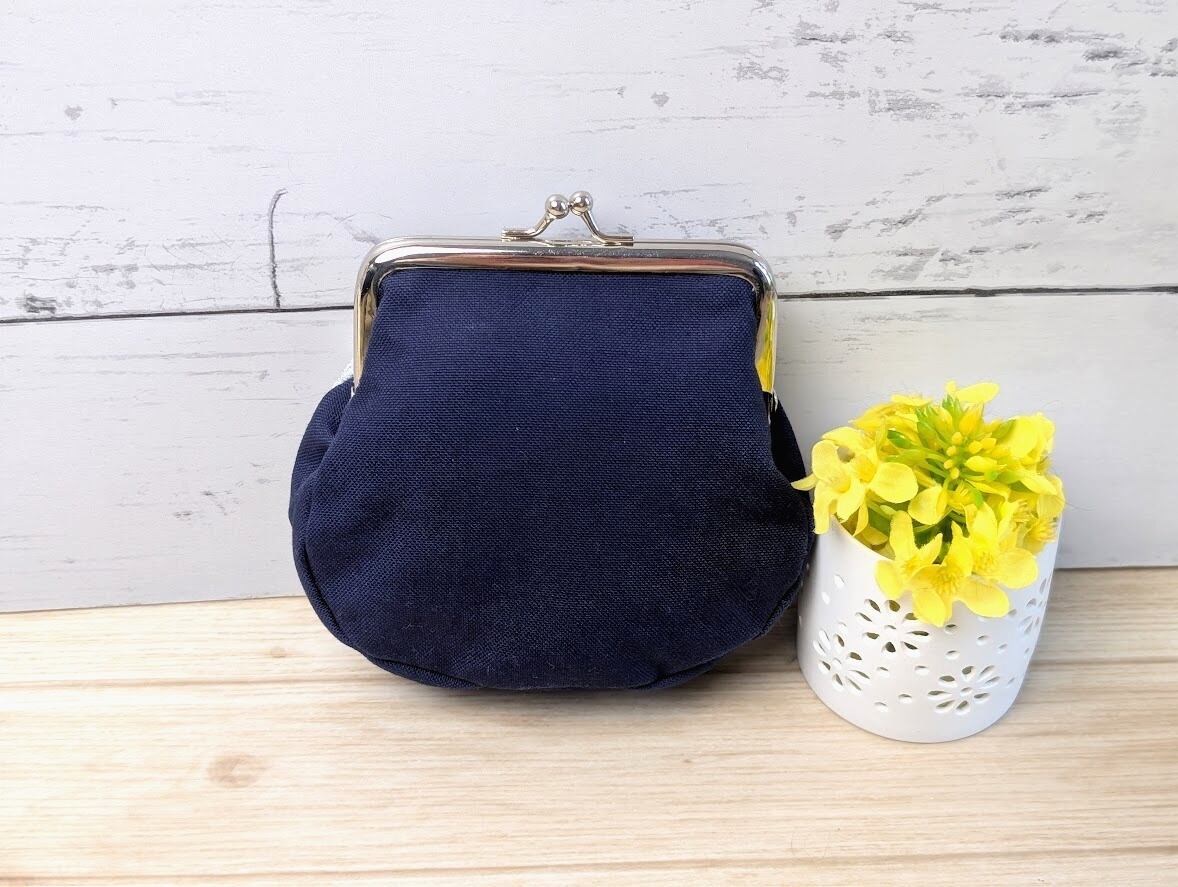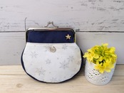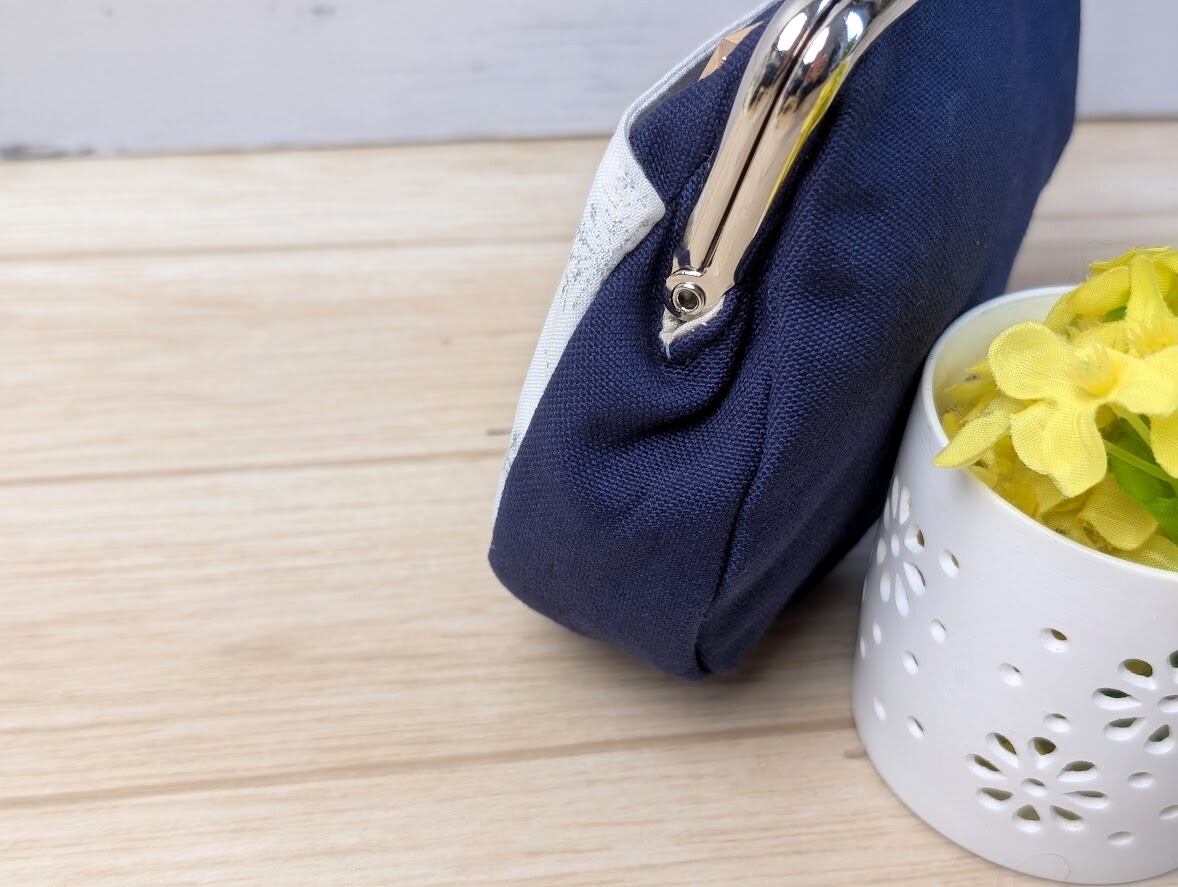 雪景色の中に舞う雪の結晶を思わせる生地を囲むように、夜を思わせる紺色がしっとりとした雰囲気のがま口ポーチです。