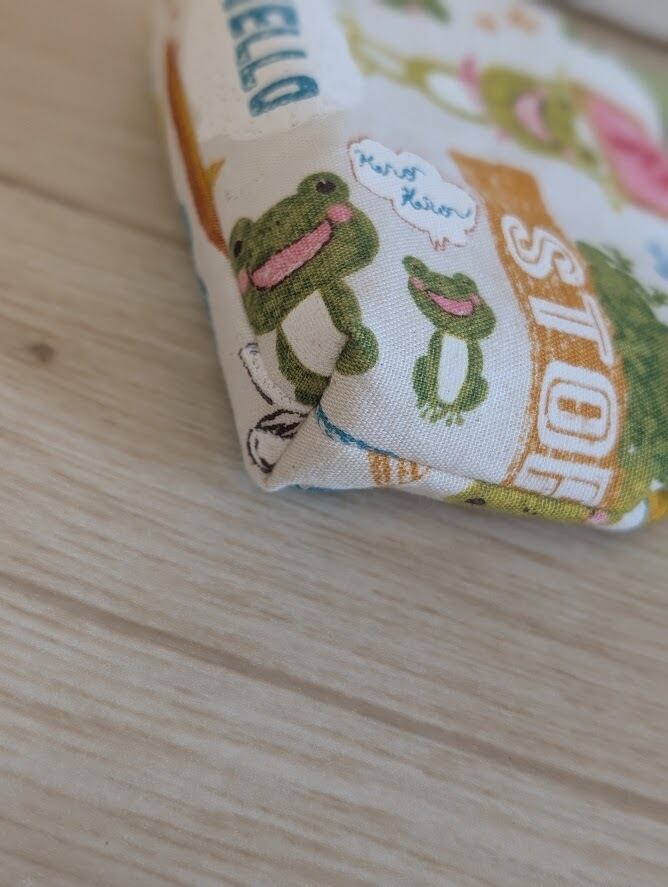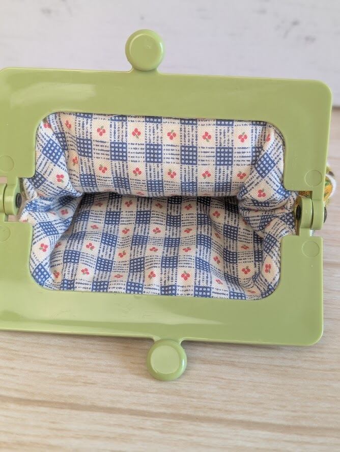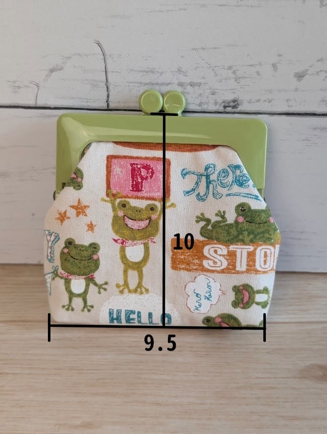 POPな柄なのでカエルちゃんに合わせた黄緑のプラスチックがま口の口金を使用しました。