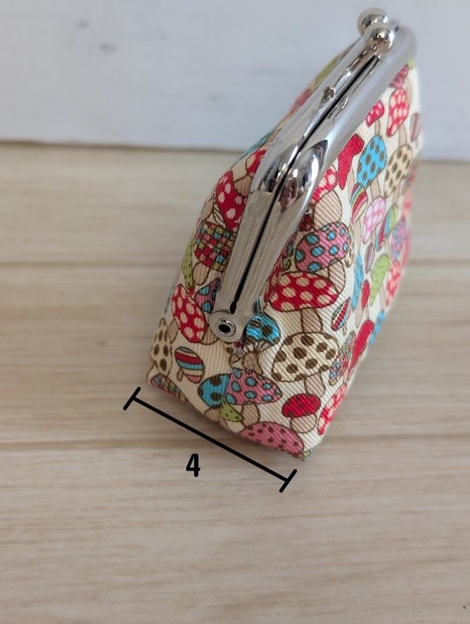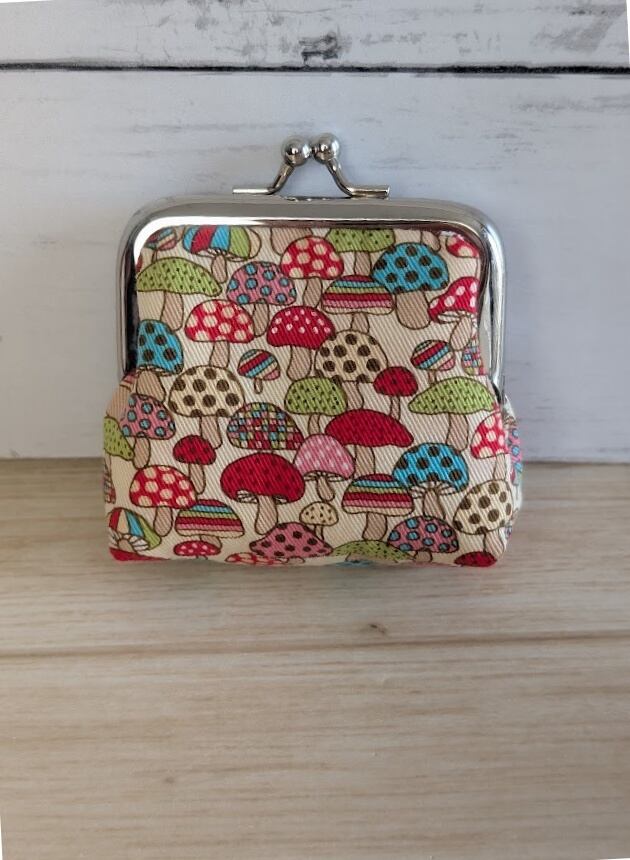 カラフルなきのこがいっぱいの可愛らしい手のひらサイズの小銭入れになります。