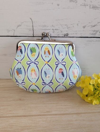 カラフルで愛らしいインコが並んだ、ぷっくりと可愛いがま口ポーチです。