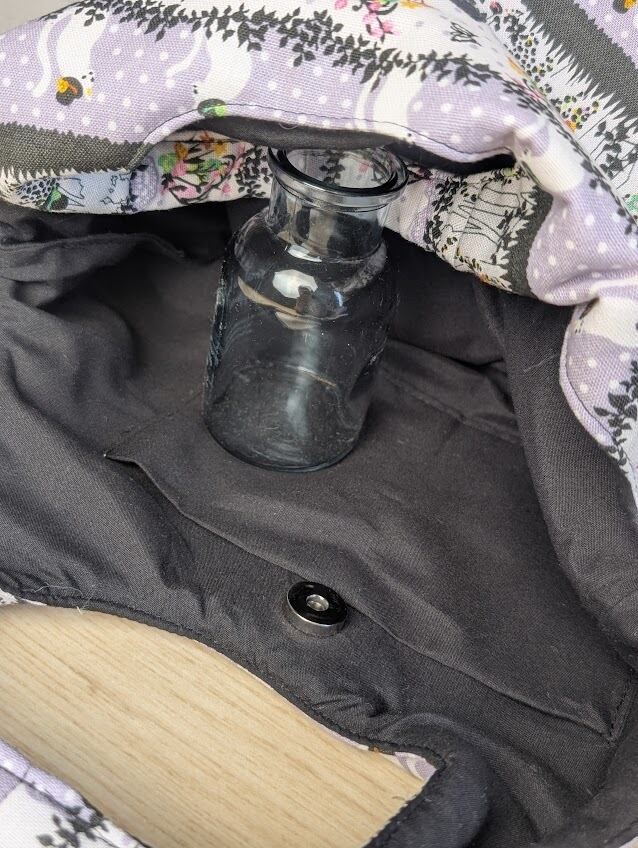 バッグの口にはマグネットホックを一つつけているので、中身が全部見えてしまうのを防ぎます。