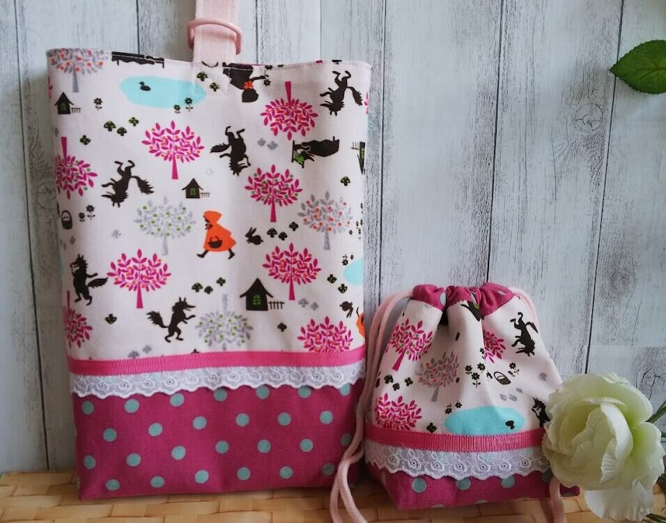 単品で販売しているベビーピンクの赤ずきんちゃんのコップ袋とシューズケースのセットになります。キラキラとレースとピンクでかわいいを閉じ込めました。