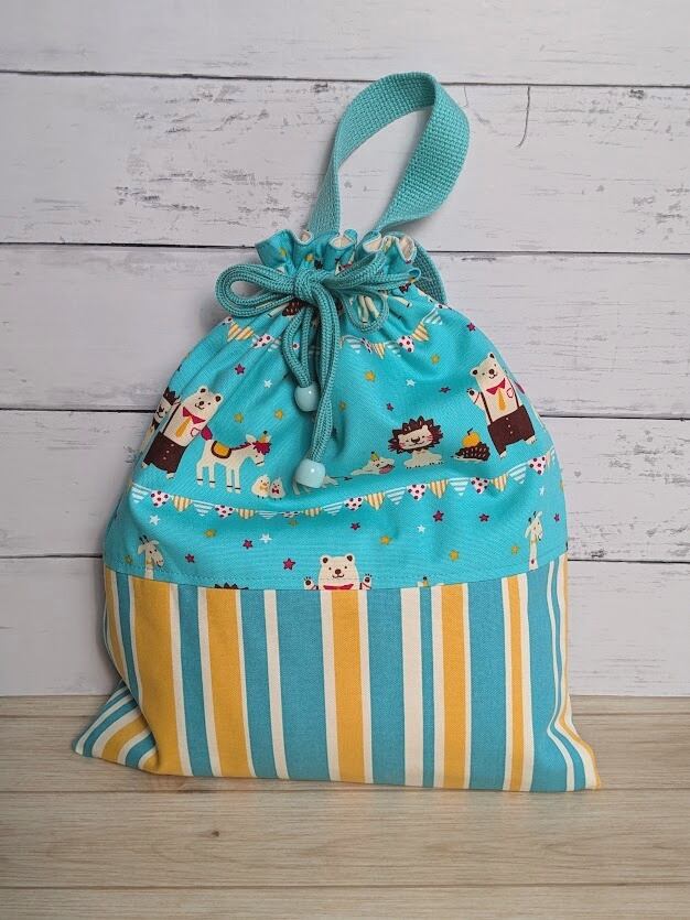 レッスンバッグ、上履き袋、体操着入れの三点セットになります。きれいなターコイズブルーの中に沢山の楽しそうな動物さんたち。星もガーランドも賑やかでまるでパーティーのようでこちらもウキウキしてしまいますね。