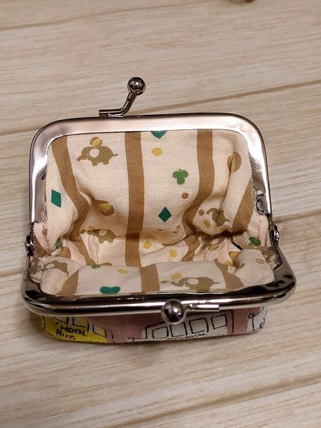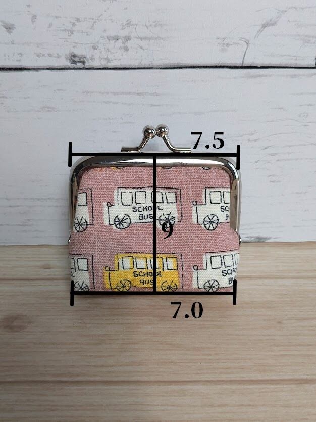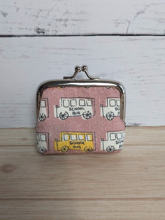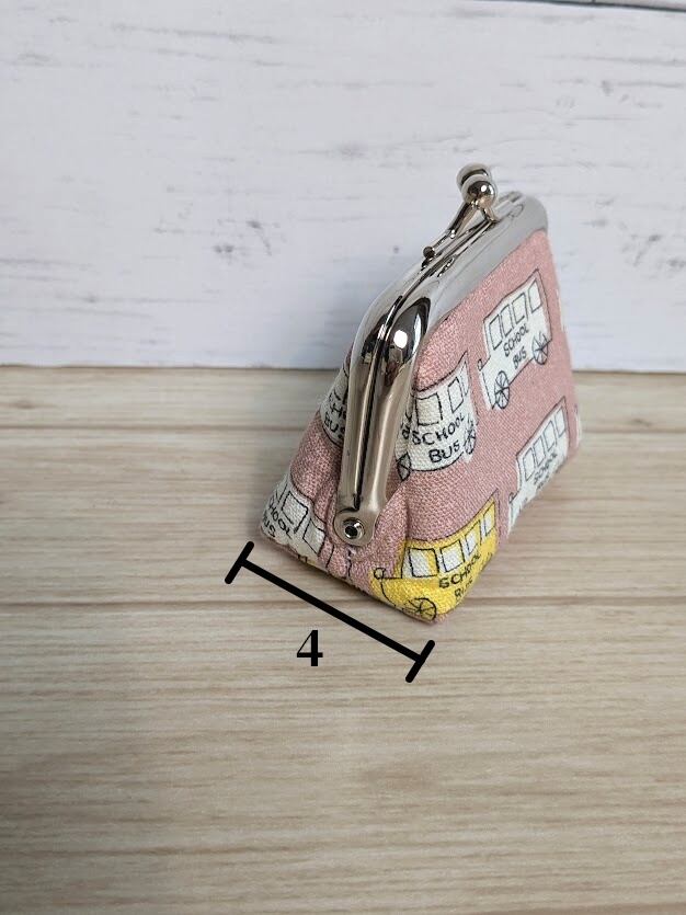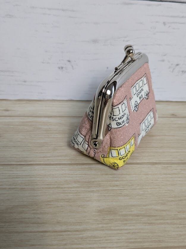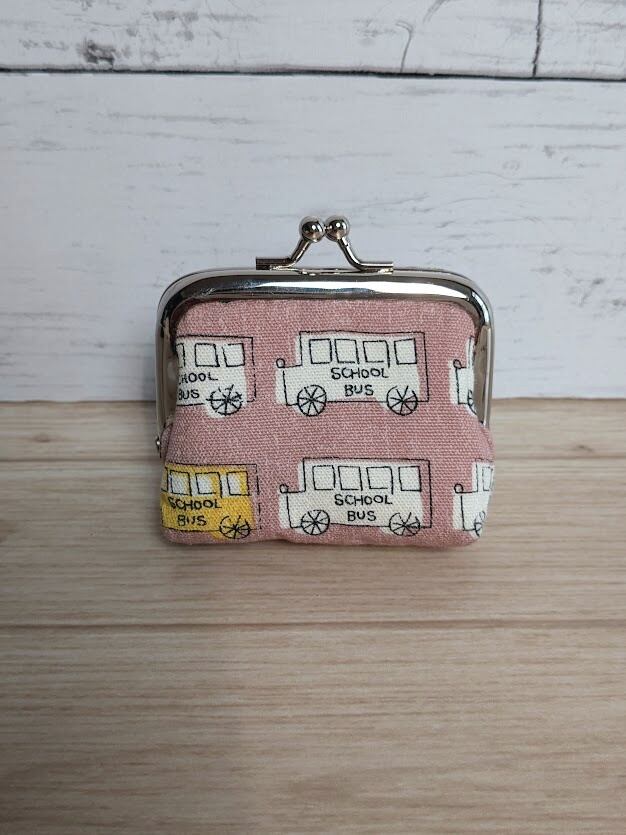 ふんわり柔らかなスモーキーピンクの中に可愛らしいスクールバスがいっぱい走っている小銭入れです。