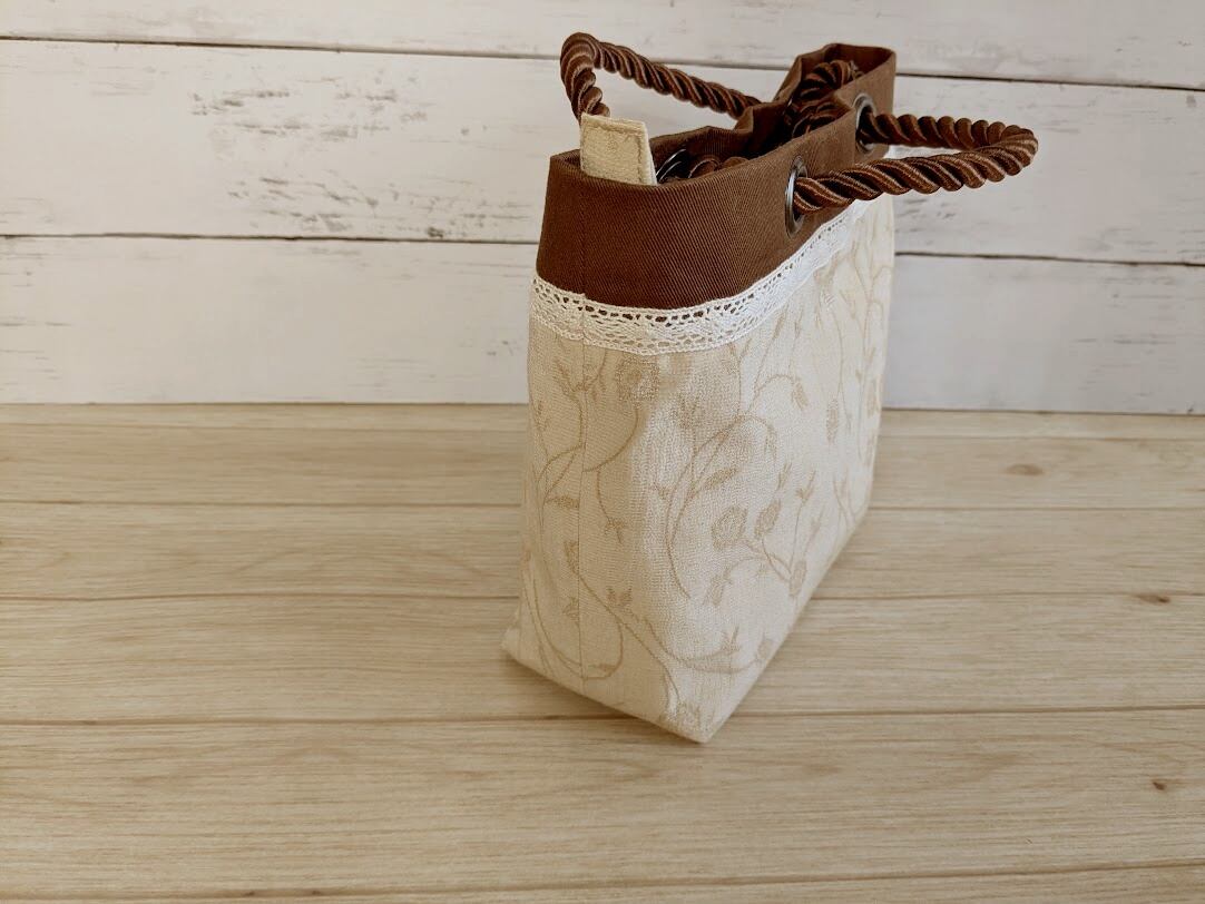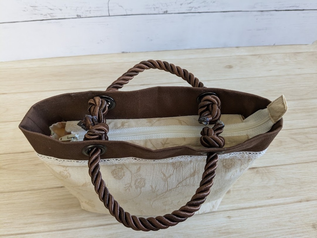 バッグ上部は茶色、切替部分にはレース、内布にはアンティークローズと、かわいいをいっぱい詰めました。