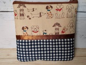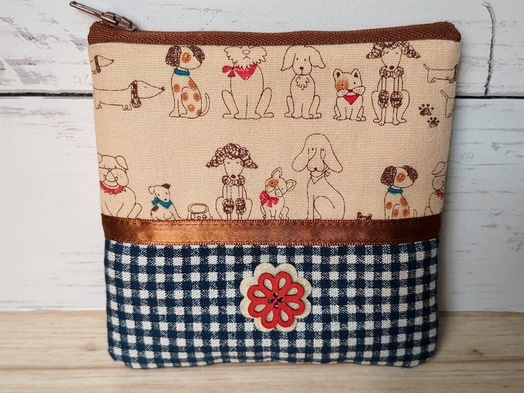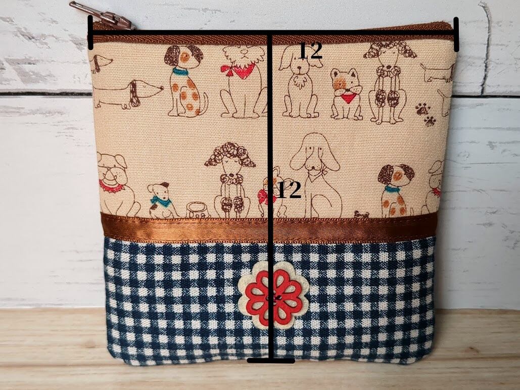 ワンちゃんのスカーフと同じ色の紺のチェックを切り替えに、同じくスカーフと同じ色の赤の花ボタンを中心にあしらいました。