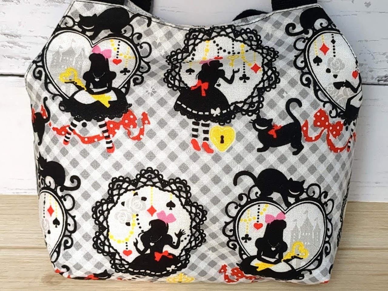 グレーのチェックの中にモノクロなアリスの生地で小さなミニバッグを作りました。